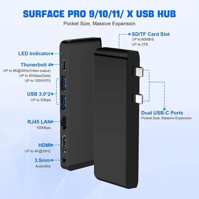 Specially designed for Surface Pro 9Specifically developed for Microsoft Surface Pro 9, which turns the 2 USB-C connection into 8 ports (2 X USB 3.0 ports, 1X 4K@30Hz HDMI port, 1X USB C Thunderbolt 4 port (8K@30Hz Video Display + 40Gbps Data Transfer + 100W Charging), 1X 100Mbps RJ45 Ethernet, 1X SD card slot, 1X TF (Micro SD) card slot, 3.5mm Audio. Just plug and play, no driver needed. Note: This Surface pro 9 hub docking will not be able to tightly connect to your Surface Pro 9 if your Surface Pro 9 uses a protective case.