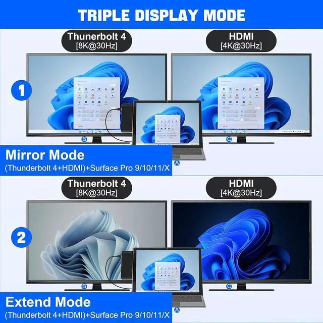 Triple Display Surface pro 9 docking stationTriple display ( Ultra HD 4K@30Hz HDMI + 8K@30Hz USB-C Thunderbolt 4 ) + Surface Pro 9 modes boost your efficiency 3 times. This usb hub for Surface pro 9 allows you to extend 2 monitors which provide more space for work and you can do different project on different monitors. Support Extend Or Mirror Mode, HDMI Resolution up to 4K@30Hz, USB-C Thunderbolt 4 resolution up to 8K@30Hz; An ideal Gadget for Video Editor, Photography, Programmer.