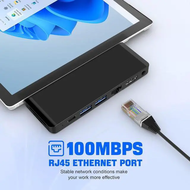 Surface Pro 9 Adapter with RJ45 Ethernet & 3.5mm Audio Output Dock for surface pro 9 offers full 10/100 Mbps over RJ45 Ethernet port, download movies quicker, transfer files faster, reduce latency, surface pro 9 hub ensure the Wi-Fi connection more stable. It also comes with a 3.5mm audio+microphone 2-in-1 port, making listening or speaking a breeze.