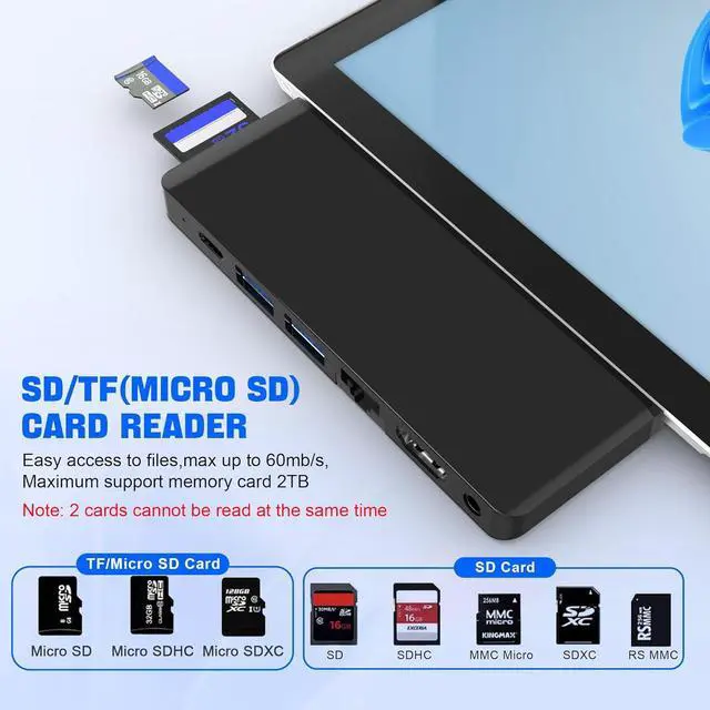 High speed data transferType C Thunderbolt 4 supports 40Gbps data transmission, USB 3.0 port up to 5Gbps transfer. The built-in SD/TF (Micro SD) slot allows for easy access to files from SD/TF memory cards with a super speed of up to 480Mbps. Compatible with SDXC, SDHC, SD, MMC, RS-MMC, TF, Micro-SDXC, Micro-SD, Micro-SDHC, Mini-SD and UHS-I cards up to 2TB, allows you to transfer photos, videos, music and files quickly.