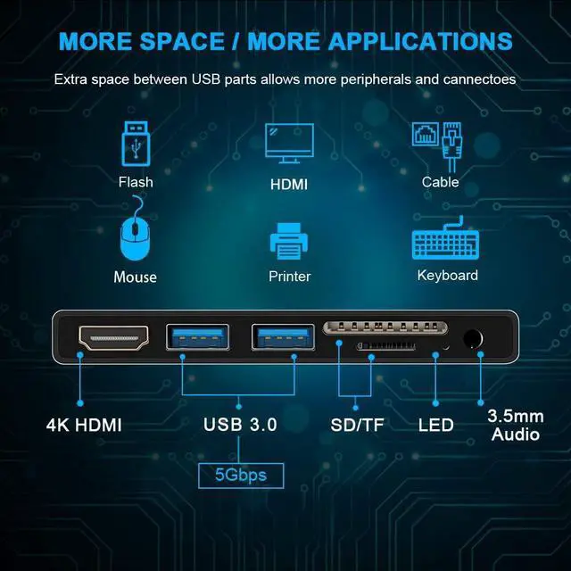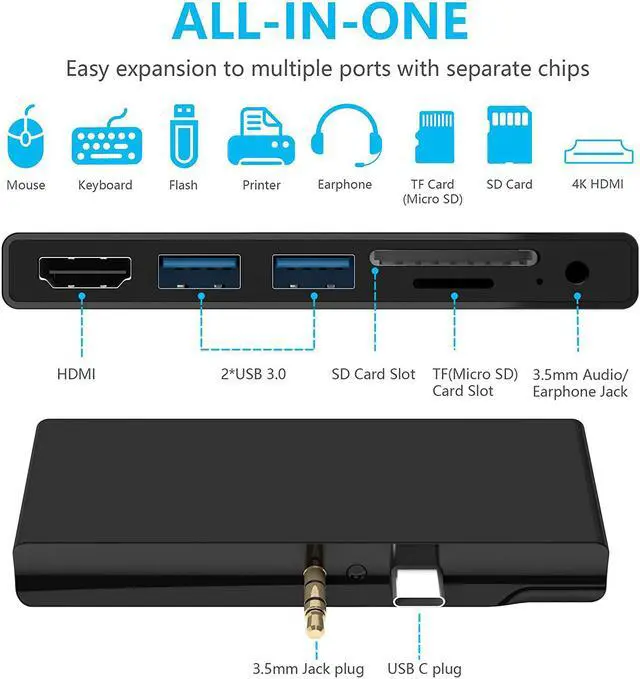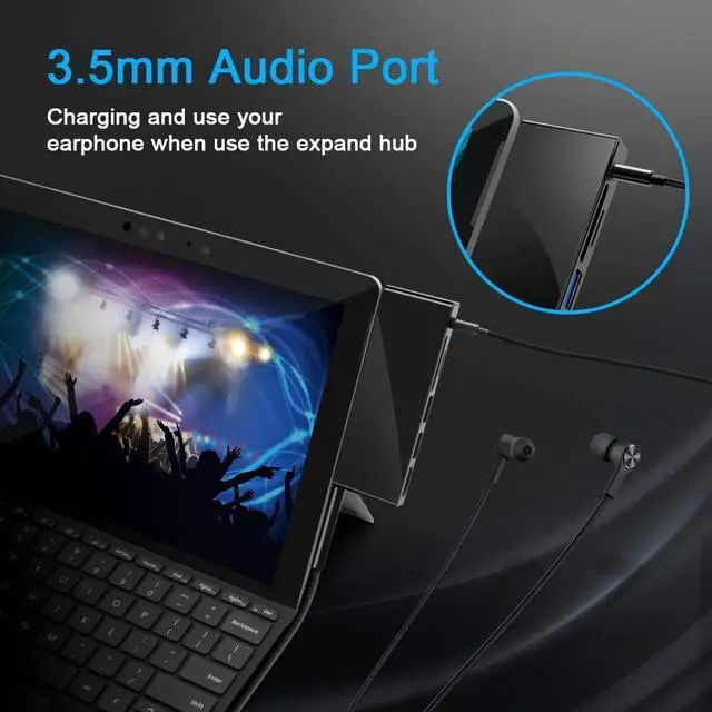 Multiport USB C HubEasily extend one USB C port to 4K HDMI, 2 USB 3.0 ports, 3.5mm Headphone Jack, SD/TF Card Reader, without install drive, plug and play. Specially designed for Microsoft Surface Go1/Go2/Go3.(Note:please do not use with protective case).