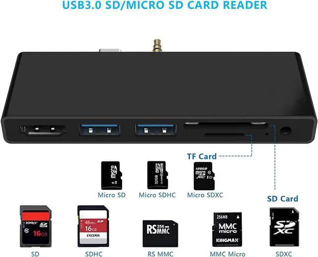 Hub with Audio and Mic 2 in 1 Port & Card Reader Adapter Audio and Mic 2 in 1 Port makes listening, talking, or recording a breeze.Plug in your earphone and listen to crystal clear music and sounds from your Surface Go1/Go2/Go3.Simultaneously support USB 3.0 ports/SD/Micro SD data transfer, which allow you upload and download photos, videos, music and other files in second.