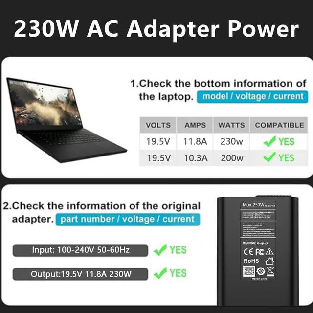 SpecificationInput: 100-240V 50-60Hz, Output: 19.5V-11.8A 230W(Also Compatible 200W 150W). Connector size: 4.5*3.0mm Blue Tip. Compatible with hp 230w Gaming Laptop Computer Slim Smart Charger Power Supply Adapter Cord Blue Tip, Compatible with HP Omen X 15-dg0000 Compatible with Omen 15-ce000 15-ce500 15-dc0000 15-dc1000 15-dh0000 15-dh1000 15-ek0000 15-ek1000 15-en0000 15-en1000