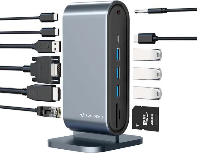 Connection Options - The computer docking station / laptop docking station dual monitor lets you charge your phone or other devices with 1x front-facing USB-C 3.0 (5Gbps, 20W PD), and keep expanding with 4x USB 3.0 (5Gbps), an SD card reader, Gigabit Ethernet, and audio in and out ports