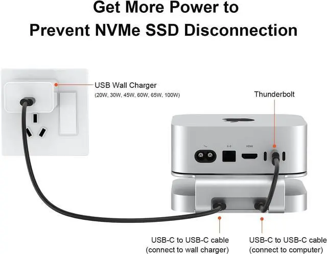 Additional USB-C for Power Supply: It has a USB-C port on the rear panel for connecting a USB wall charger for more power and to prevent the NVMe SSD from disconnecting while in use.