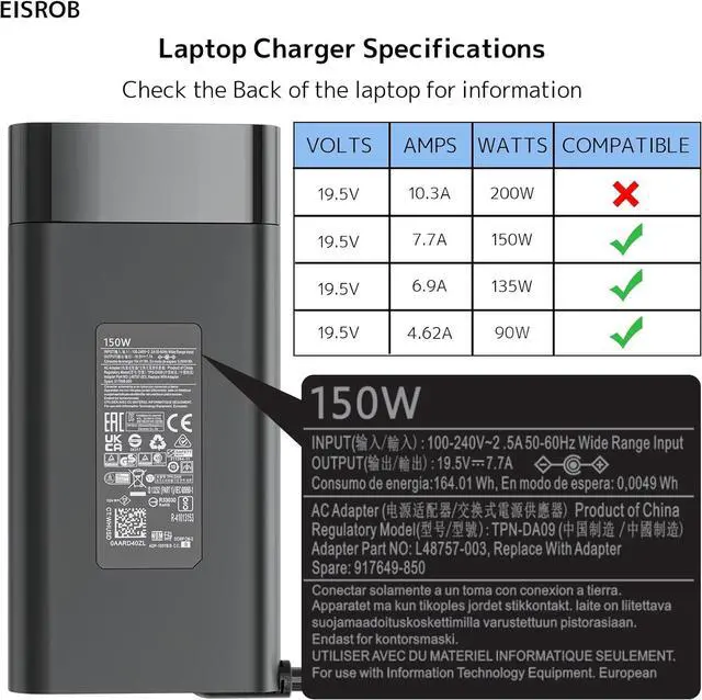 1.SpecificationsInput: 100-240 V~2.5 A 50-60 Hz; Output: 19.5 V~7.7 A 150 W; Max Power: 150 watt (Compatible with 19.5 V~6.9 A 135 W / 19.5 V~4.62 A 90 W); Connector Size: 4.5 mm x 3.0 mm blue tip; Not for laptops over 150W!