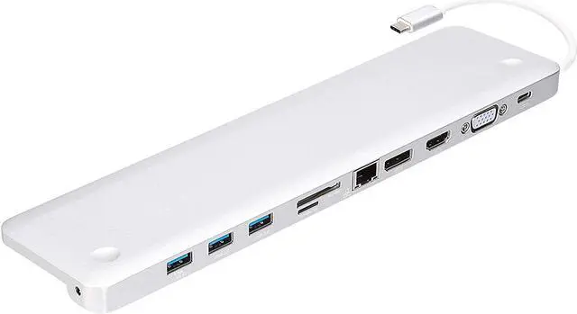 11-in-1 multi-port Type-C docking station includes DisplayPort, HDMI, VGA, USB-A (x3), Ethernet, SD/TF card reader, audio, and a Type-C charging port (PD 100 watts); aluminum pedestal-style housing with a Silver finish