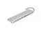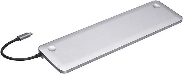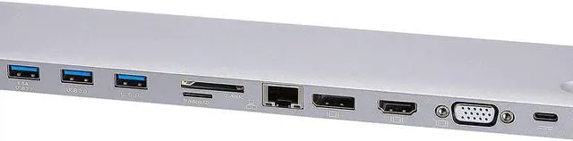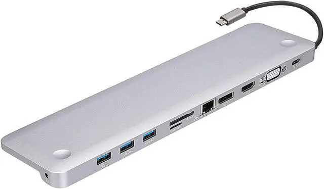 11-in-1 multi-port Type-C docking station includes DisplayPort, HDMI, VGA, USB-A (x3), Ethernet, SD/TF card reader, audio, and a Type-C charging port (PD 100 watts); aluminum pedestal-style housing with a Grey finish