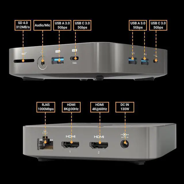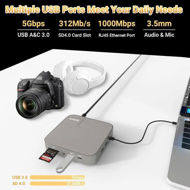 [11-IN-1 usb c Docking Station] This laptop docking station with 2xHDMI ports, 3xUSB-A 3.0 ports and 1xUSB C 3.0 port supports max 5Gbps data transfer speed, 1xUSB-C port connects to the host laptop, 1xSD 4.0 card slot with data reading speeds of up to 312MB/s, 1xRJ45 Ethernet port, 1x3.5mm Audio & Mic Jack, and 1xDC-IN Port.