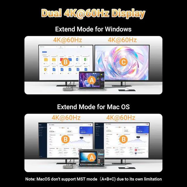 [Dual HDMI 4K@60HZ Display] This docking station has 2 video output ports, HDMI2.0 and HDMI2.1 ports. When connected to 2 external monitors through these two video ports, both monitors can display images up to 4K@60HZ, making cross-screen multitasking and creative workflows more efficient