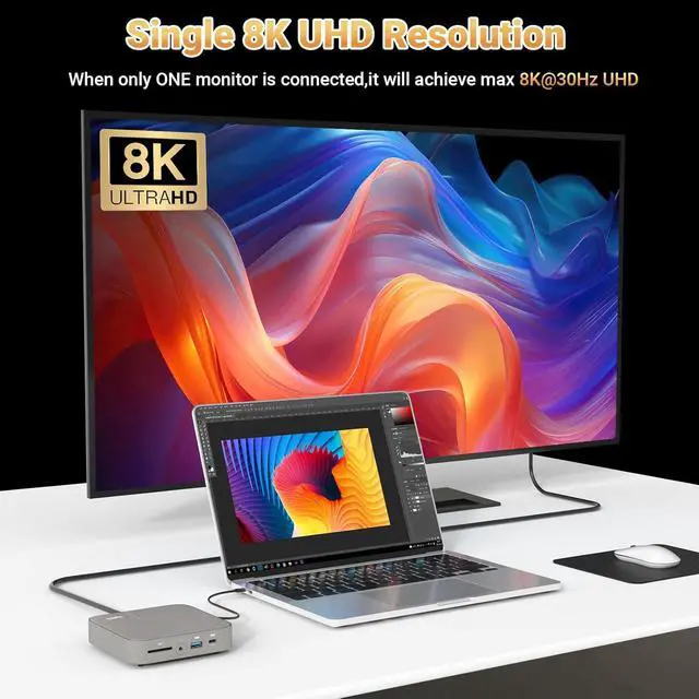 [Support 8K Docking Station] One HDMI2.1 port on this USB C hub supports up to 8K@30HZ resolution and is backward compatible with 4K@120HZ, 4K@60HZ, 2K@120HZ and 2K@60HZ. It can be used in scenarios such as business meeting HD projection screens and home HD theaters. (Please note: To achieve 8K, your computer, monitor and conversion cable must support 8K. Our docking station itself has no value-added functions)