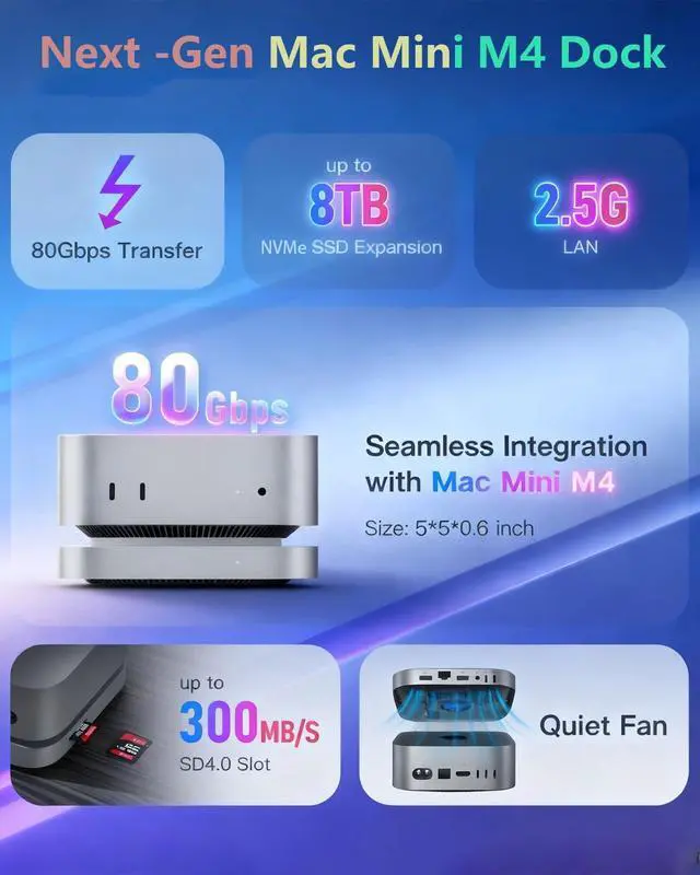 Superspeed Data Transfer Up to 80GbpsOur Mac mini M4 dock supports new technology with up to 80Gbps bandwidth for ultra-fast data transfer ideal for high-performance drives and HDDs. Note: Actual transfer speeds may vary depending on your host devices new version and system capabilities.2.5G Ethernet Port for Faster NetworkingEnjoy smoother online browsing and faster network speeds with the integrated 2.5G Ethernet port.Professional-Grade SD4.0 SlotDesigned for photographers, the SD4.0 card slot supports transfer speeds up to 300MB/s, enabling quick photo and video transfers with ease.