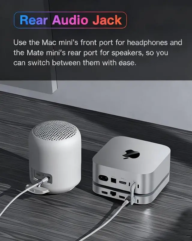 Built-in Quiet Fan & Supplementary Power Port: A heat sink and 360° cooling vents keeps the Mate mini staying cool and running at high speed for a long time. All peripherals with a power below 15W can be powered directly by Mac mini, and the Type-C PD3.0 port supports an external PD adapter to power peripherals with a power above 15W