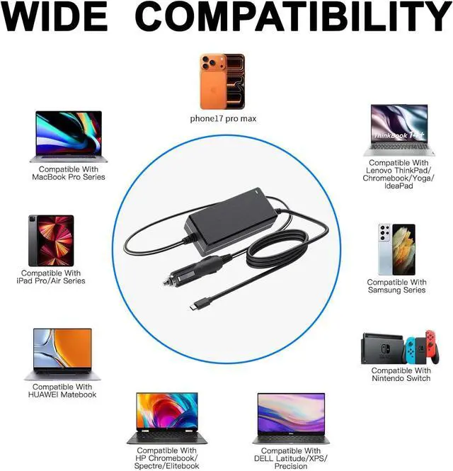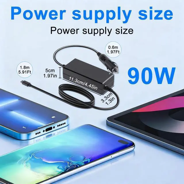 90W USB-C Charger for CarThe laptop charger that's the size of a phone charger. A PD 90W output delivers high-speed charging to laptops, tablets,smartphones, and all USB-C devices.