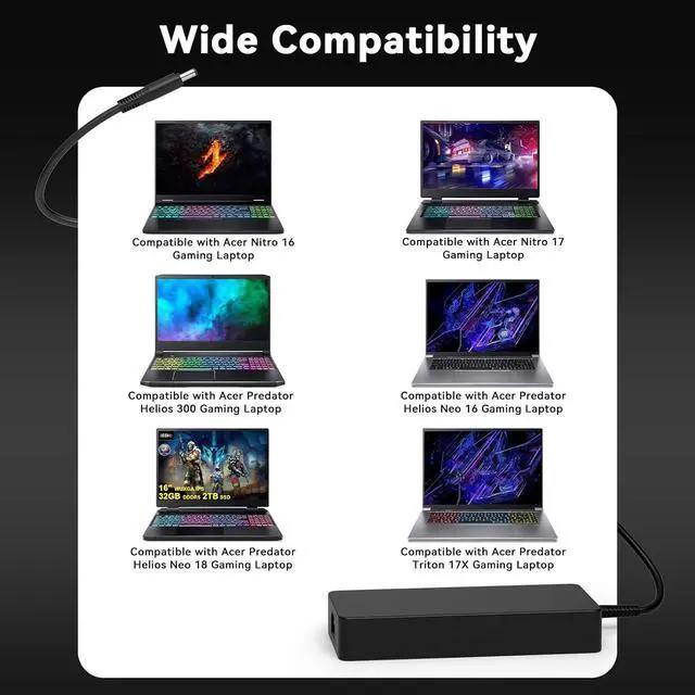 SafetyThe 330W laptop charger AC Adapter suitable Compatible with acer has been made of high-quality materials, power cord has multiple protections: overcharge protection; Overvoltage protection; Overheating protection; Overcurrent protection; Short circuit protection; Lightning resistant laptop charger. You won't get stuck while playing games, giving you a smooth and beautiful gaming experience. This charger is suitable for various occasions, ensuring that your electronic devices always run efficiently