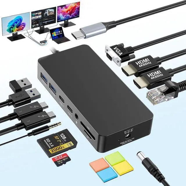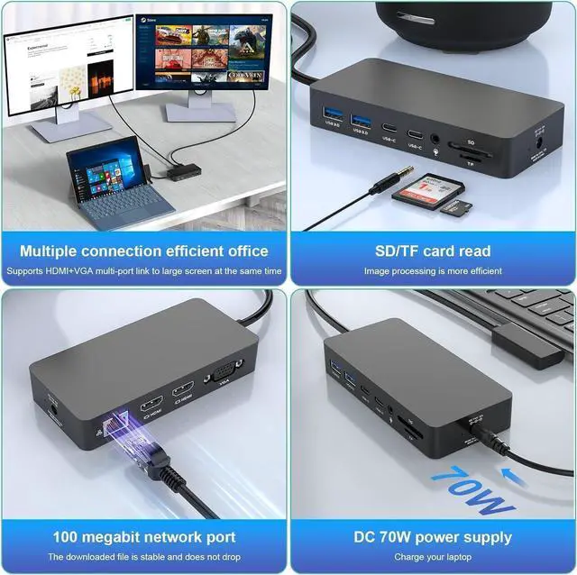 12-IN-1 Surface Docking StationThe Microsoft Surface Dock utilizes advanced surface connectivity technology to instantly transform your Surface device into a desktop computer, providing the versatility you need for all your needs. This 12-in-1 three-monitor dock for Microsoft Surface Pro includes 2* 4K@60Hz HDMI ports, 1080P@60Hz VGA port, Gigabit RJ45 port, 2* USB-C data ports, 2 * USB 3.0 ports, SD/TF micro SD card slot and 72W DC power supply. Simplify your setup. Enhance your workflow.