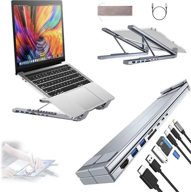 [USB C Docking Station Stand]: Our lightweight and foldable laptop stand safely supports laptops from 10-17 inches and features 8 integrated ports for all your connectivity needs. USB C docking station for USB C macOS and Windows laptops is equipped with 4K HDMI, 2*USB 3.0(up to 5Gps), 1*USB C PD 3.0 port, and 1*USB-C Data, 1*SD, 1*TF(support simultaneous reading of USB3.0 data). The USB C dock stands perfectly combine the function of a USB C dock and a laptop stand, making it the best choice for your USB C laptop with more features and possibilities.