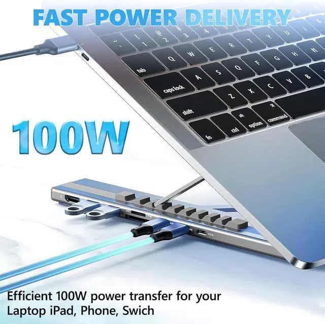 [Ultra-Speed Data Transfer and 100W Power Delivery]: The portable laptop dock with 2 USB-A ports supports data transfer speed up to 5Gbps, allowing you to quickly transfer files. You can also connect a keyboard, mouse, USB flash drive, or hard drive to a variety of laptops, including MacBook Pro and MacBook Air, without any lag. The USB-C port supports data transfer rates up to GEN1. The SD/TF card slots offers superior data storage with transfer speeds of up to 104MB/s. The PD charging port supports power delivery up to 100W, allowing you to charge your laptop at up to 100W.