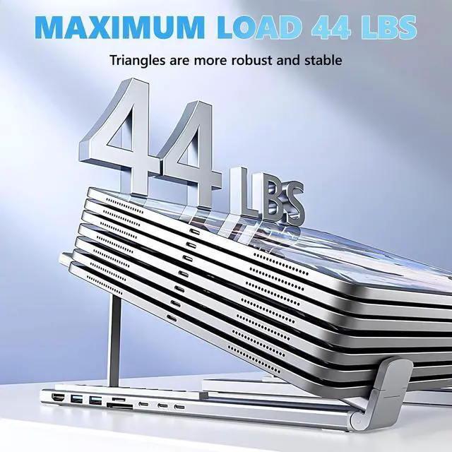 [Ergonomic Design Laptop Stand]: The laptop docking station stand features 9-levels to adjust the height, allowing you to choose the perfect angle for your posture and body type. It can help you relieve tension from neck pain, back pain, and eye strain, allowing you to work comfortably and stay healthy. The triangular support design makes the laptop stand more stable. The non-slip silicone pads on the stand can secure your laptop in place, protecting your device from scratches and slipping. The forward tilt angle and open design provide greater ventilation and more airflow to cool your laptop while in use, rather than lying flat on a table.