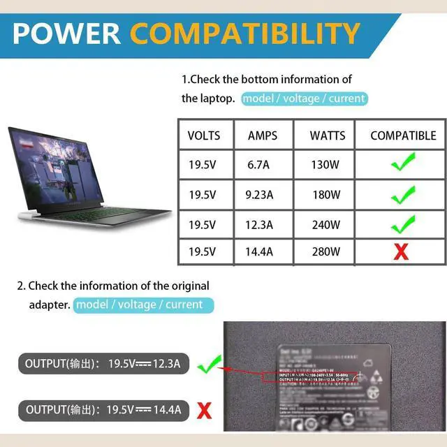 240 Watt Power SupplyInput: 100-240V 1.5 (50-60 Hz), output: 19.5V 12.3A (Compatible with 19.5V 9.23A 180W; 19.5V 7.6A 150W; 19.5V 6.7A 130W; 19.5V 4.62A 90W) Connector size: 7.4*5.0MM