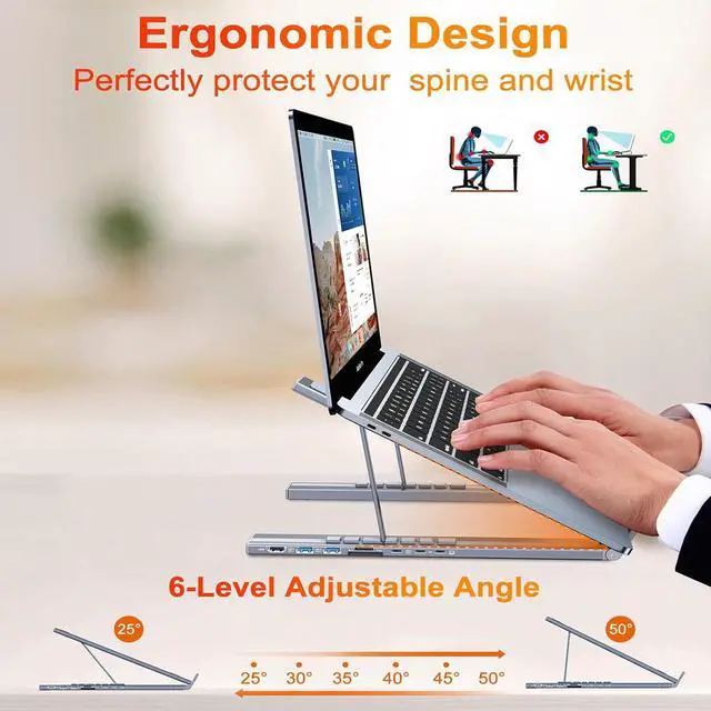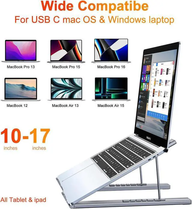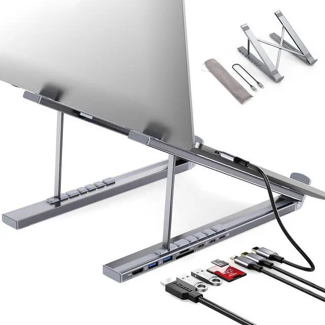 Portable and Lightweight MaterialCrafted from durable aluminum, the docking station is both sturdy and lightweightweighing just 500g (1.1lbs) and folding down to a compact size of 10.5 x 2.2 x 0.9 inches. It can support up to 20kg (44lbs), making it ideal for a wide range of laptops and tablets. The package includes a velvet bag and a USB-C cable, perfect for business trips, remote work, or home office.