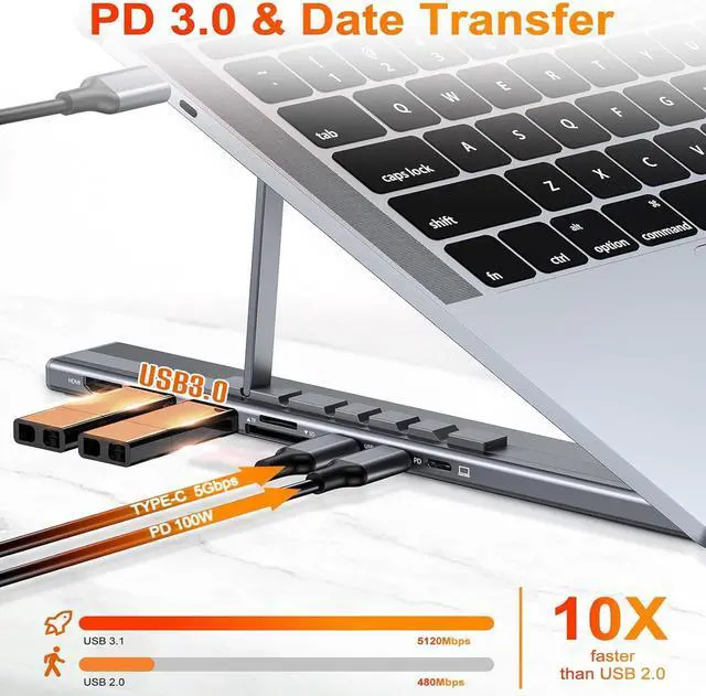8-in-1 Multifunctional ConnectivityThis innovative laptop docking station integrates 8 essential ports: 4K HDMI, 2 USB-A 3.0 (up to 5Gbps), 1 USB-C PD 3.0 charging port, 1 USB-C data port, 1 USB-C Female port, 1 SD card slot, and 1 TF card slot. Whether you're connecting an external monitor, keyboard, mouse, or storage device, this all-in-one hub eliminates the need for multiple adapters.