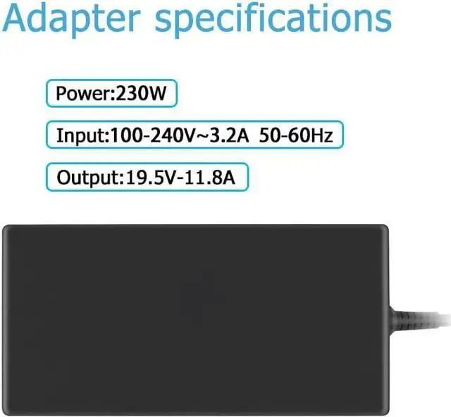 [Product Specifications]Input: 100-240V 50/60Hz, Output:19.5V 11.8A 230W, Max Output Power:230W.,Color: Black, Connector size:7.4*5.0mm,Power Plug Type: US Plug.