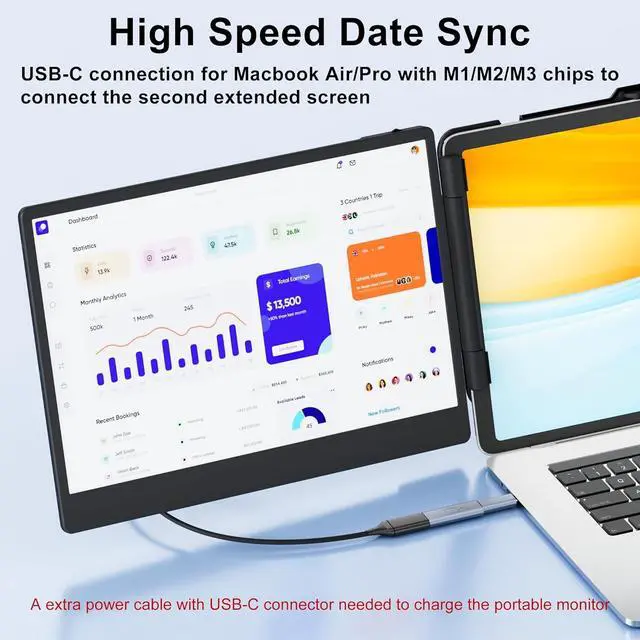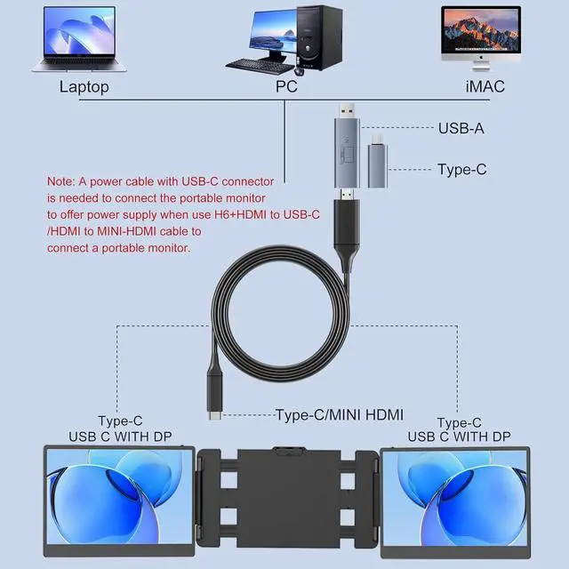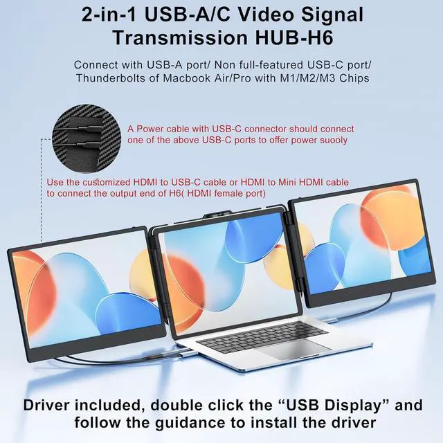 When finish installing the included "USB Display" driver and connect the output of the H6 with the included HDMI to USB-C cable or HDMI to Mini HDMI cable to the bottom USB-C port( mark "HDMI" or "USB-C with DP") or Mini HDMI port to transmit real time video signal, a power cable with USB-C end is needed to power that portable monitor.