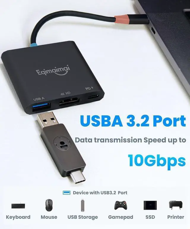 USB-A Port - USB 3.2 gen 1 standard up to 10Gb/s, realizing data transfer,can connect USB-A devices,USB flash drive,mouse,keyboard,portable hard drive,card reader and other accessories.