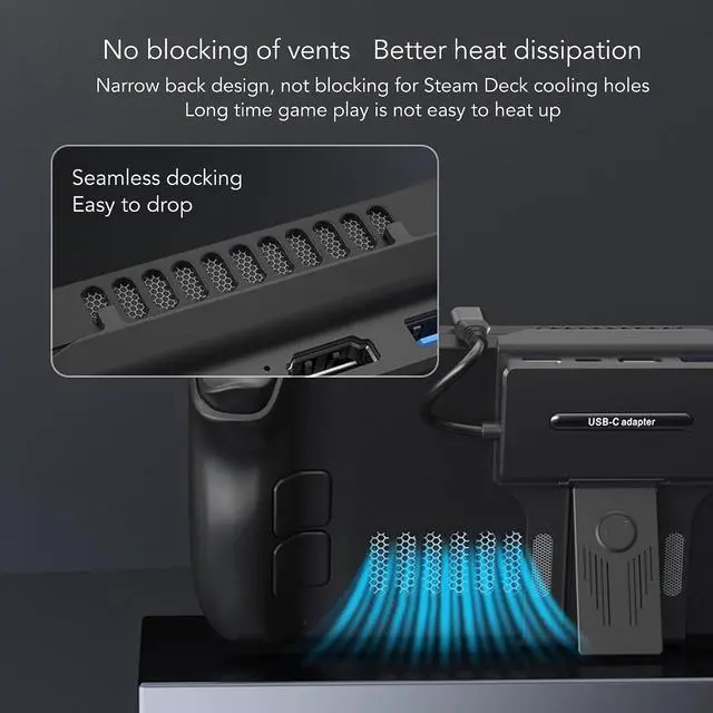 4. BETTER HEAT DISSIPATION: For Steam Deck docking station features a narrow back design that does not block for Steam Deck's unobstructed vents for better heat dissipation and less heat from long gaming sessions.