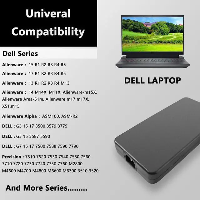 Compatible withCompatible with multiple models of DELL 240W (180W) laptops: Dell Alienware 15 R1 R2 R3 17 R1 R2 R3 13 R1 R2 R3 R4; Alienware M15 R1 R2 R3 M17 R1 R2 R3 R4 R5 M11X R2 R3 M14X R1 R2 M17X R2 R3 R4; Dell G3 Series 15 17 3579 3779 3500 G5 15 5587 5590 5500 G7 15 17 7588 7500 7590; Dell Precision Series 7720 7520 7530 7710 M6800 M4600 M4700 M4300.