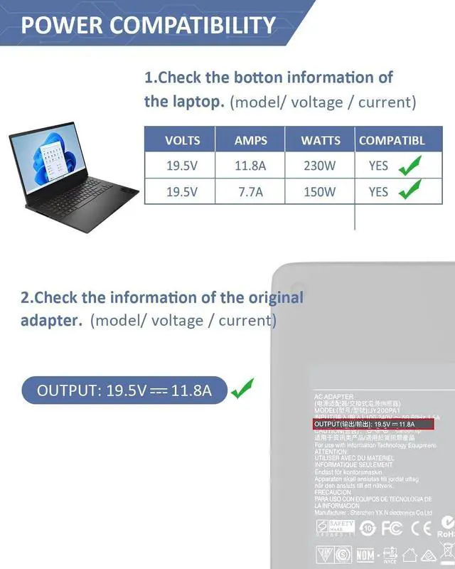 SAFETY & PROTECTIONThe perfect replacement for 230W HP laptop computer chargers.The built-in IC chip technology provides overload / short-circuit / overheat protection, so theres no worries about damaging functional devices.