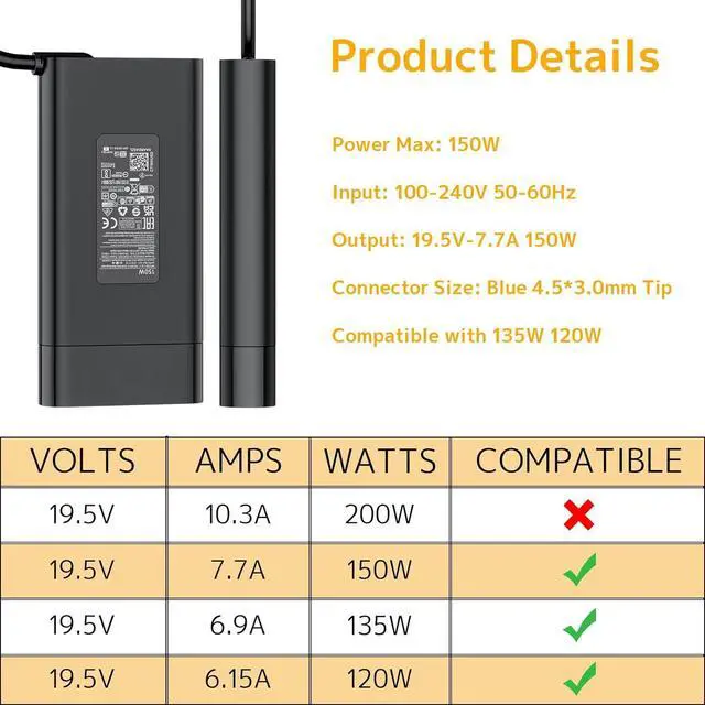 1.Power Specs: DC Output: 19.5 V-7.7 A 150 W (Compatible with HP 19.5 V-6.9 A 135 W), AC Input: 100-240 V 50-60 Hz, Connector size: 4.5mm * 3.0mm Blue Round Tip (Note: Please do not buy it if your laptop uses the 200w 19.5V 10.5A, 230W 19.5V 11.8A charger)