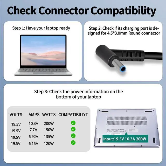 PRODUCT PARAMETERSPAEBAI+ 200W HP Laptop Charger Input: AC 100 -240V, 50/60Hz; Output: 19.5V 10.3A 200W Max. Connector Size: 4.5*3.0mm Power: 200W