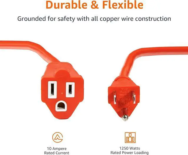 RELIABLE POWER: 100-foot indoor/outdoor extension cord rated 10 Amps, 1250 Watts and 125 VAC