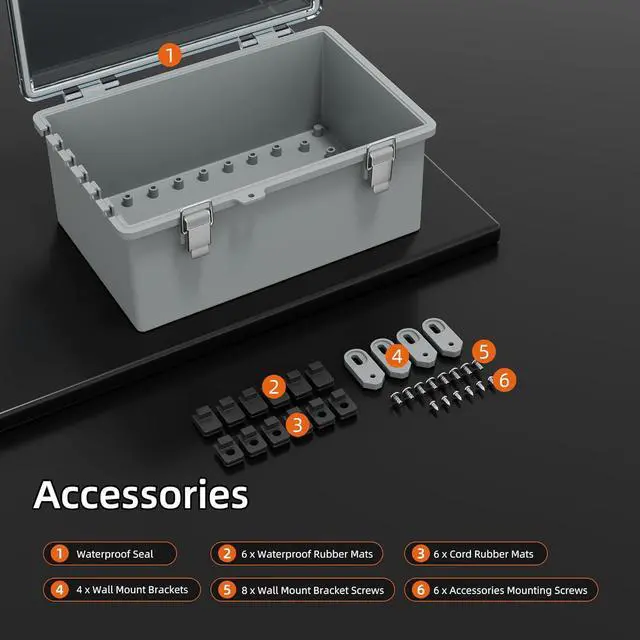 Wide Applicable Cord Range - There are total 6 cord holes on the outdoor electrical box, each hole will be equiped with a seal plug and a cord plug, which help you easily and conveniently organize the wires, suitable for 14/16/18 AWG wire installation.