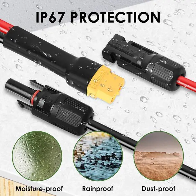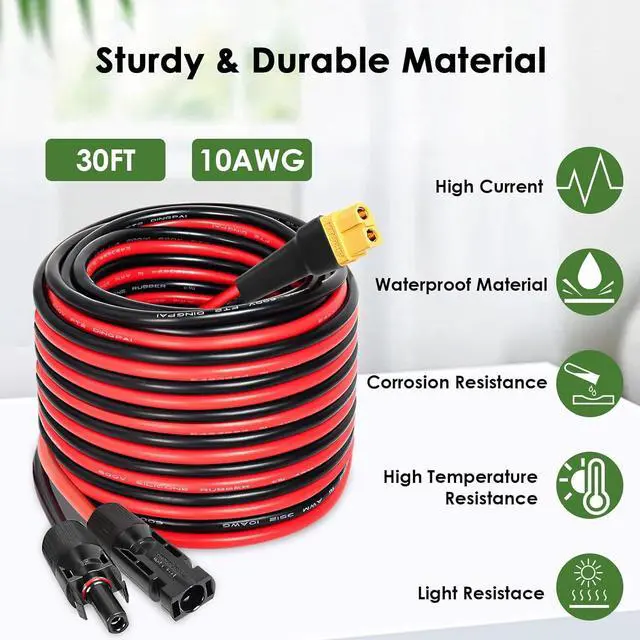 Premium Material -- The solar cable is made of 10AWG tinned copper wire,which minimizes power loss and improves charging efficiency.And the shell of the xt60 cable is made of high quality PVC material,which is heat-resistant to 105°C,more flexible feature made it can be bends and strapped free-and-easy.
