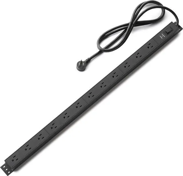 12-outlet, 600 joule power strip surge protector in durable aluminum housing with mounting holes for quick, easy installation