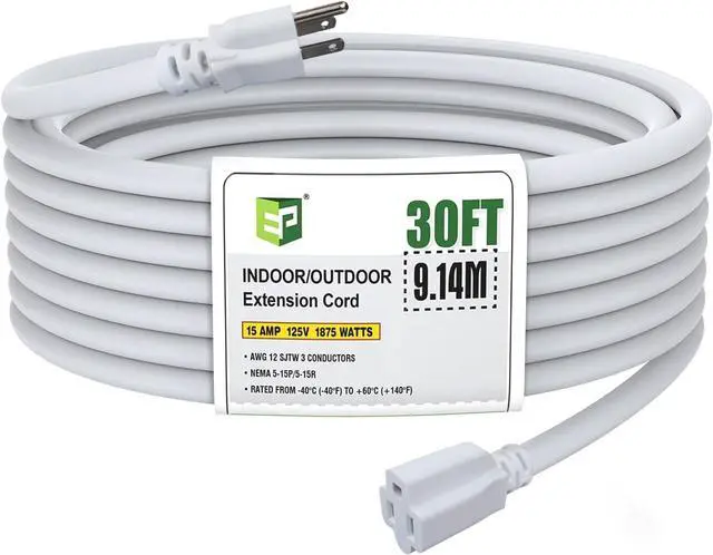 EP 30 Ft Outdoor Extension Cord, 12/3 SJTW Heavy Duty Extension Cable with 3 Prong Grounded Plug, 15 AMP Power Cord for Lawn, Garden, Appliances, White