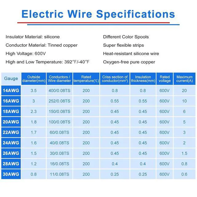 Specification:22 Gauge Flexible Hook Up Wire Kit, outside diameter: 1.7mm, high voltage:600v, maximum current: 3A, high and low temperature:392°F/-40°F, super soft silicone insulation