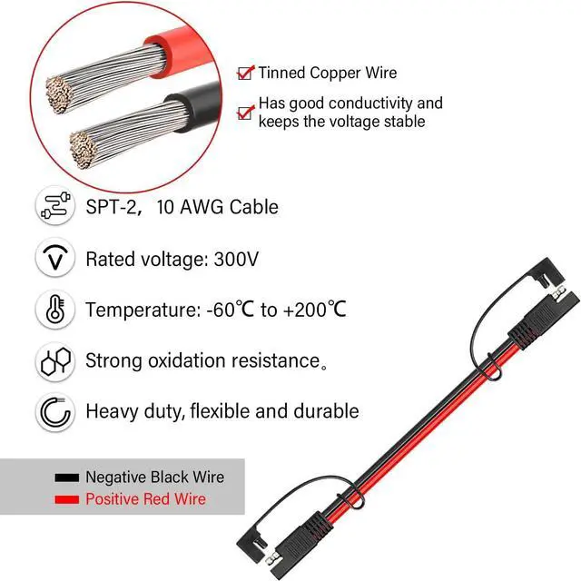 [Good Conductive] - The sae extension cable is made of 10AWG tinned copper wire, tinned copper ensures faster transmission and better stability, SPT-2, not easy to oxidation, has good electrical conductivity, temperature resistance 105C°, rated voltage 300V, rated current 50A.
