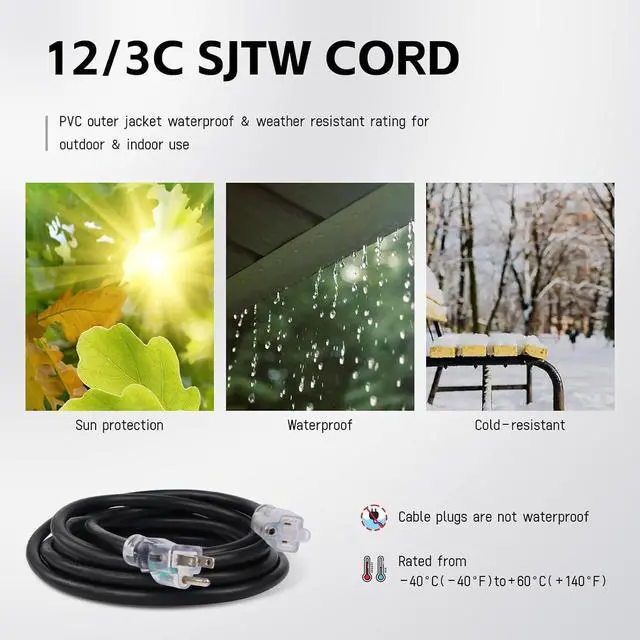 Heavy-Duty Construction for Maximum Power: This 12-gauge extension cord is built to handle heavy loads with a 15-amp, 125-volt, and 1875-watt capacity. Featuring pure copper wiring and a durable SJTW jacket, it ensures reliable performance for both indoor and outdoor use
