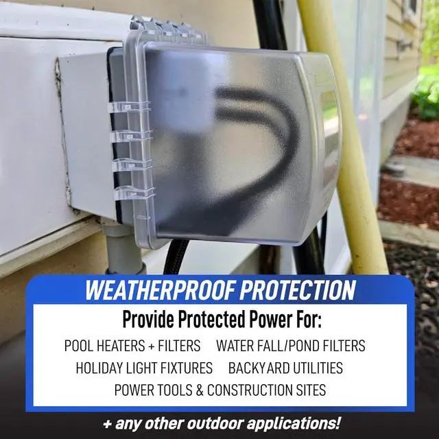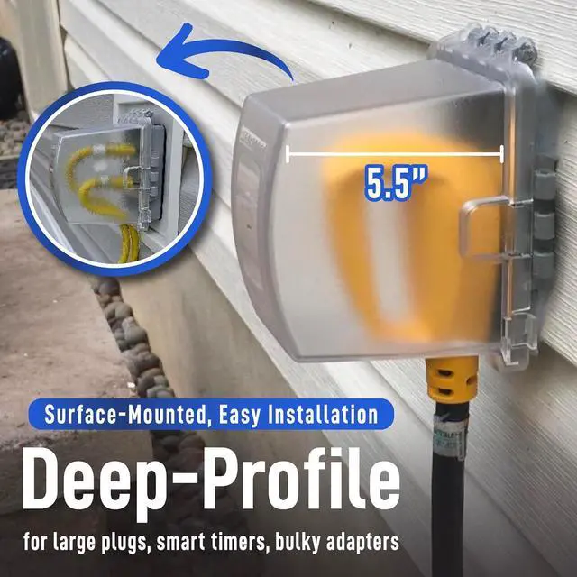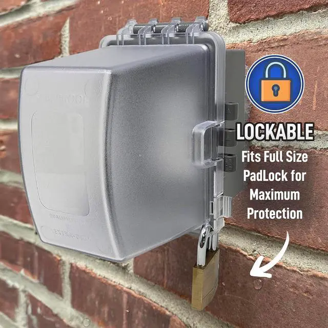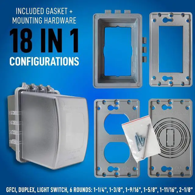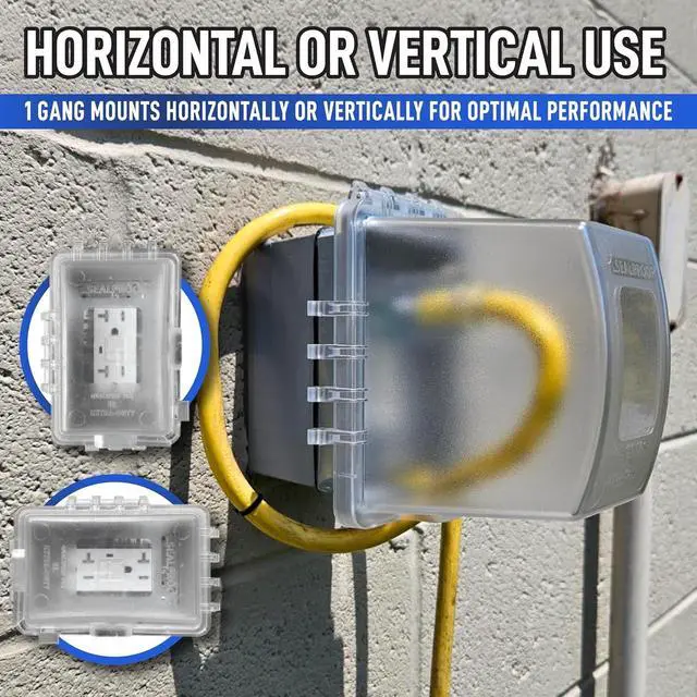 Can be used horizontally or vertically, is lockable and includes gasket and mounting hardware. Outlet box not included.