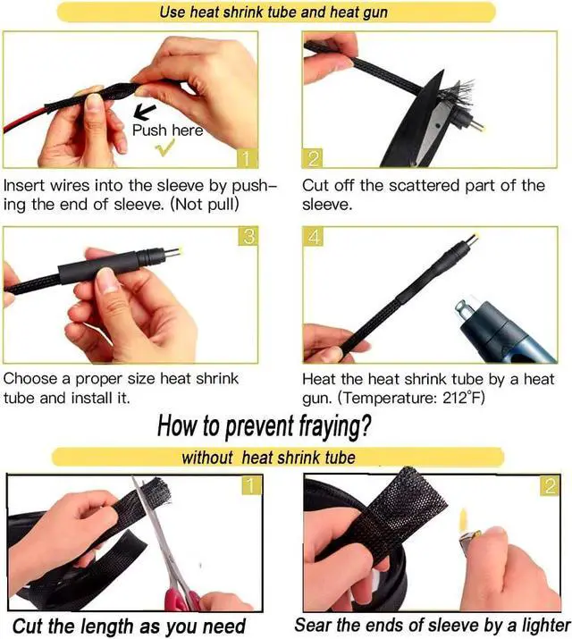 Recommended: Cut Braided Sleeving with a HOT KNIFE to prevent fraying, if a Hot Knife is not available, make sure to sear the edges with another heat source (example: use the flame from a lighter)