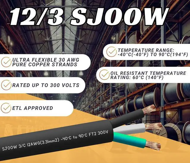 12/3 SJOOW SPECIFICATIONS: 30 AWG pure copper conductors. Rated for up to 300 volts. Temperature range: -40°C (-40°F) to 90°C (194°F). Oil resistant temperature rating: 60°C (140°F). Approved for indoor and outdoor use.