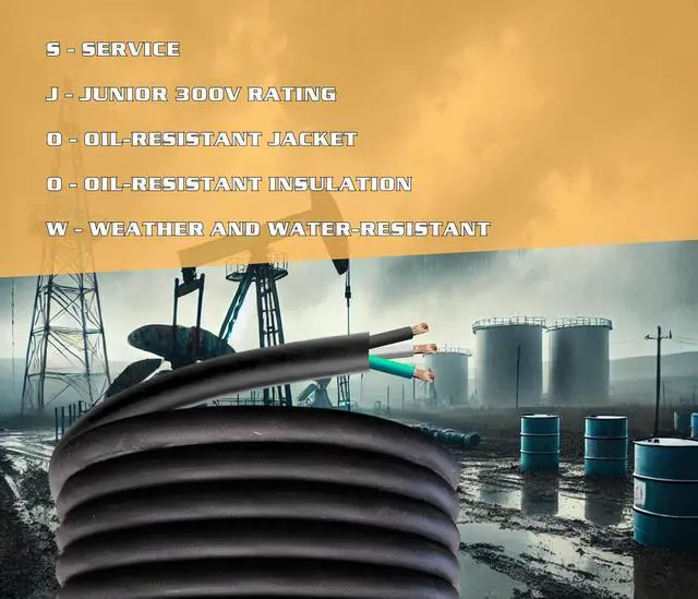 12/3 SJOOW insulation resistant to abrasion, battery acid, diesel fuel, engine coolant, engine oil, ethanol, extreme temperatures, flame, gasoline, power-steering fluid, transmission fluid, and water. Rated for outdoor use. Meets or exceeds 720 hour UV resistant aging test.