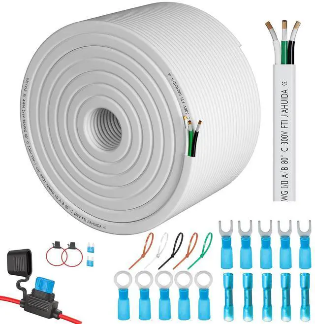 Packing List:3 Conductor 14 gauge wire is insulated with high-quality PVC, Sheath Colour BLACK with Black & Red & Green inner core excellent chemical and oxidation resistance, 5 heat shrink butt connectors, 5 ring terminals and 5 spade terminals, 5 X 3 colors cable tie, 2 X 40A fuses and fuse holders