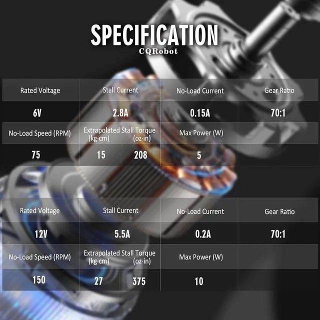 No-load Speed: @ 6V: 75 RPM, @ 12V: 150 RPM;