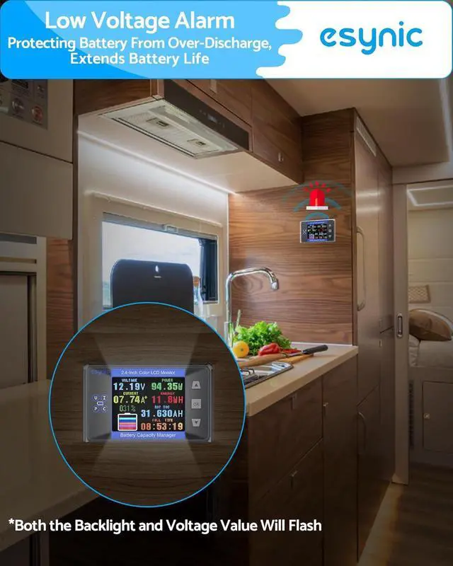 Smart Voltage Alerts----:Our eSynic smart shuntBattery Monitor Protects Your Battery InvestmentAuto-alerts when battery capacity drops to critical levels. Prevents deep discharge damage to expensive LiFePO4/lead acid batteries - extends battery lifespan by 2X.