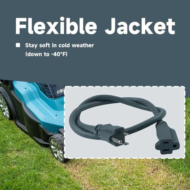Safety and Durability - UL Listed for safety, this extension powercord features a 3-prong grounded plug and reinforced blades to prevent bending or breaking. It remains flexible in all weather conditions, ensuring longevity without stiffening or cracking even in cold weather.